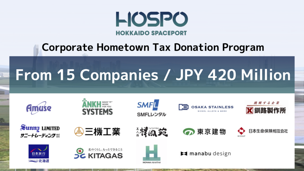 Between October and December 2025, Taiki Town Office received a corporate hometown tax donation of JPY 420 million (approximately USD 2.8 million) from 15 companies across Japan to support the development of Hokkaido Spaceport (HOSPO).